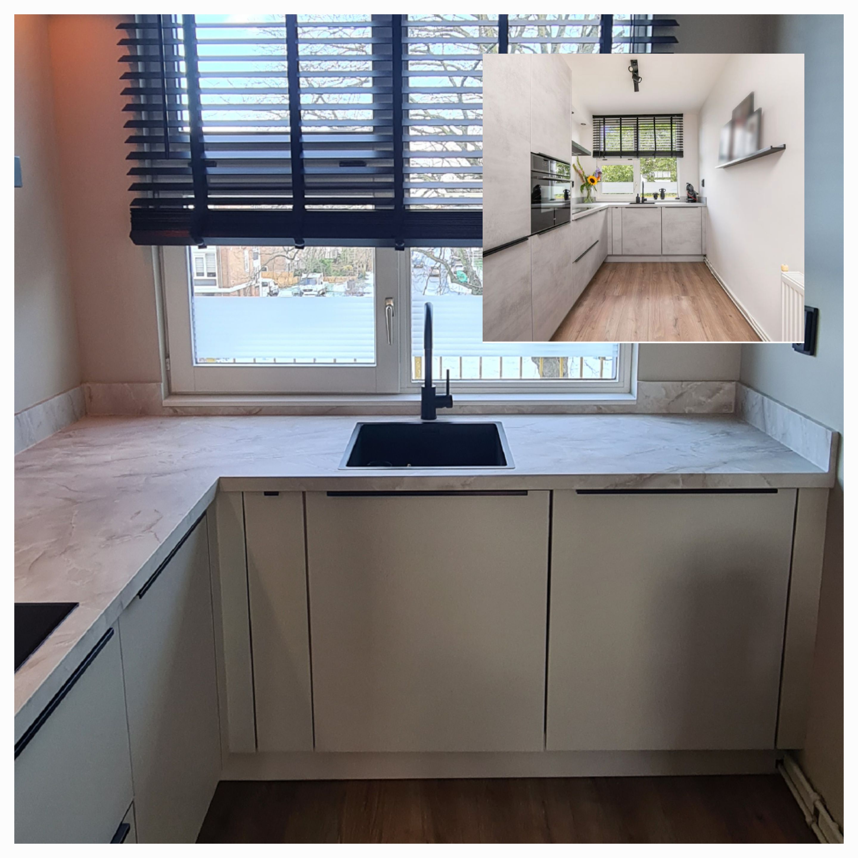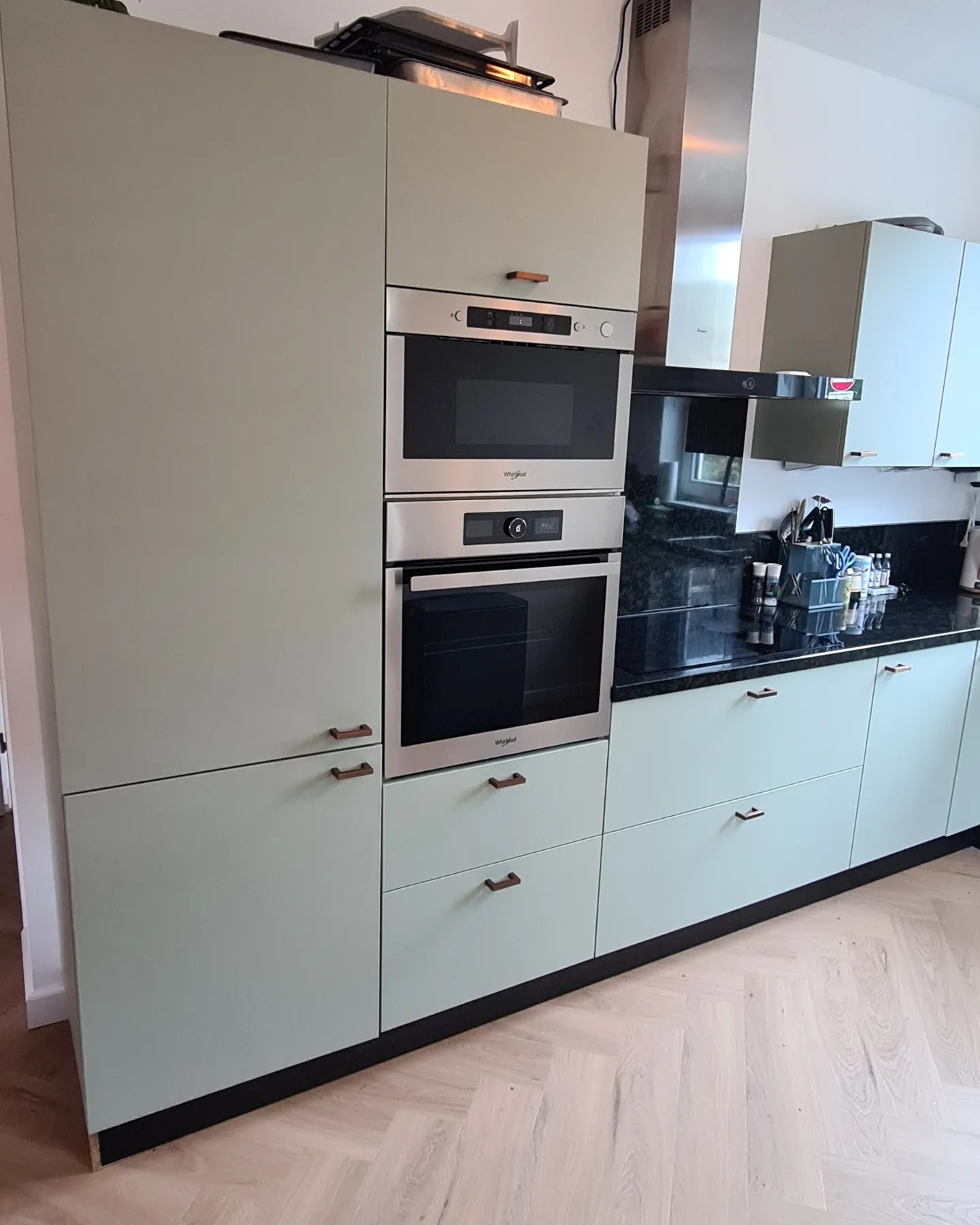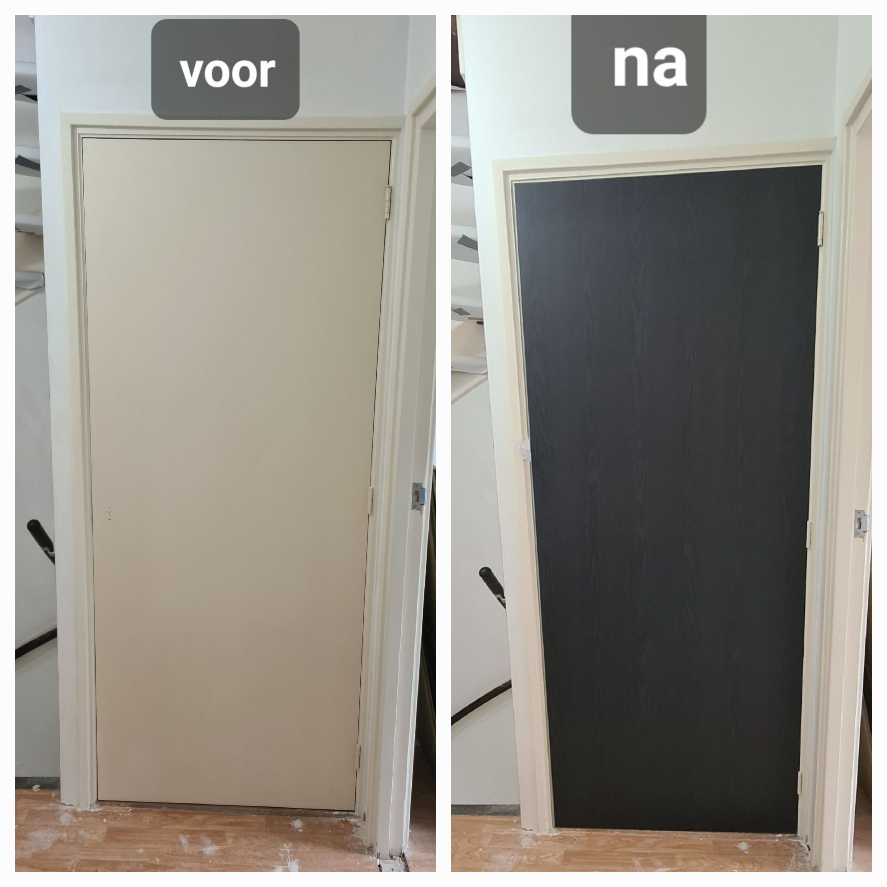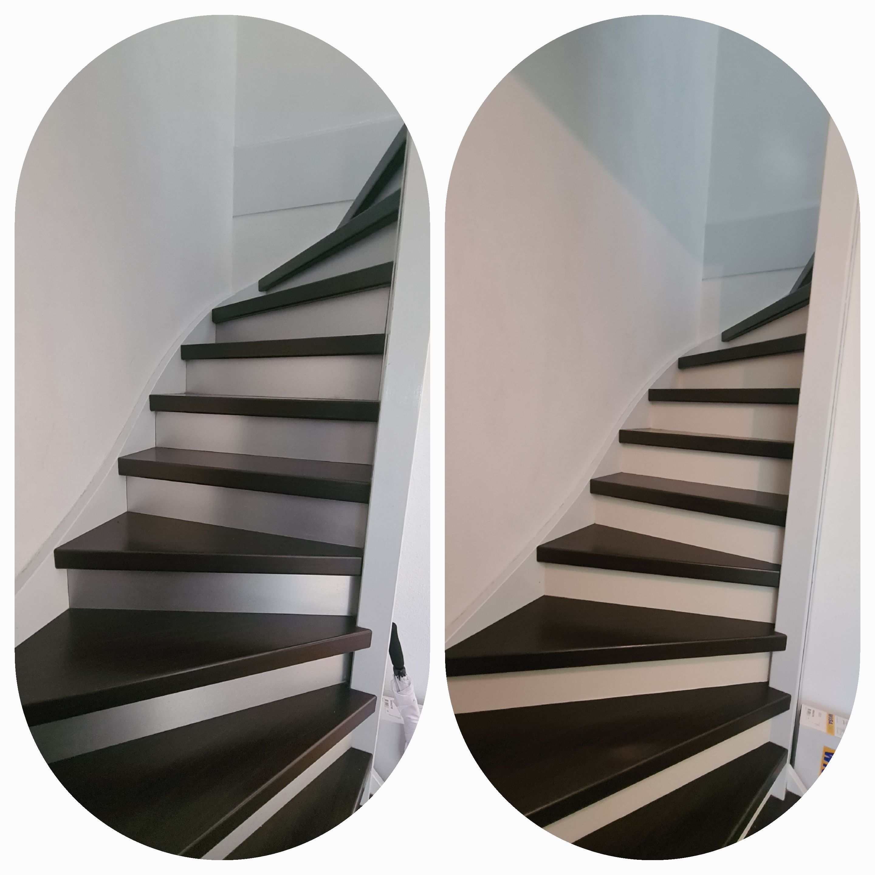 Hiernaast is houtnerffolie gecombineerd waardoor de trap een trendy en frisse uitstraling krijgt.